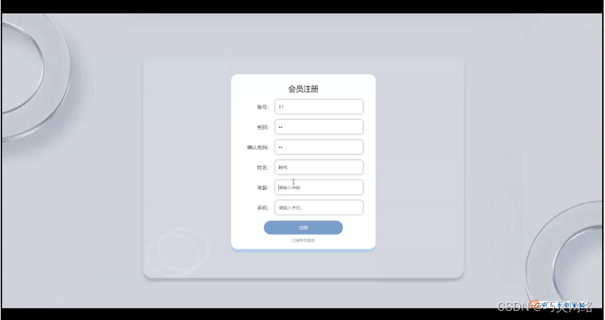 会员注册,在会员注册页面通过填写账号,密码,确认密码,姓名,年龄,手机等信息完成用户注册操作,如图5-2所示。