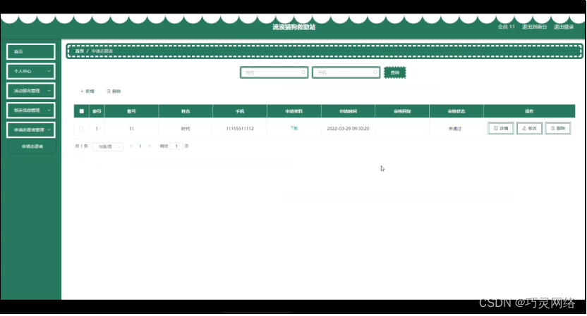申请志愿者管理,在申请志愿者管理页面可以对索引,账号,姓名,手机,申请资料,申请时间,审核回复,审核状态等内容进行详情,修改和删除操作,如图5-15所示。