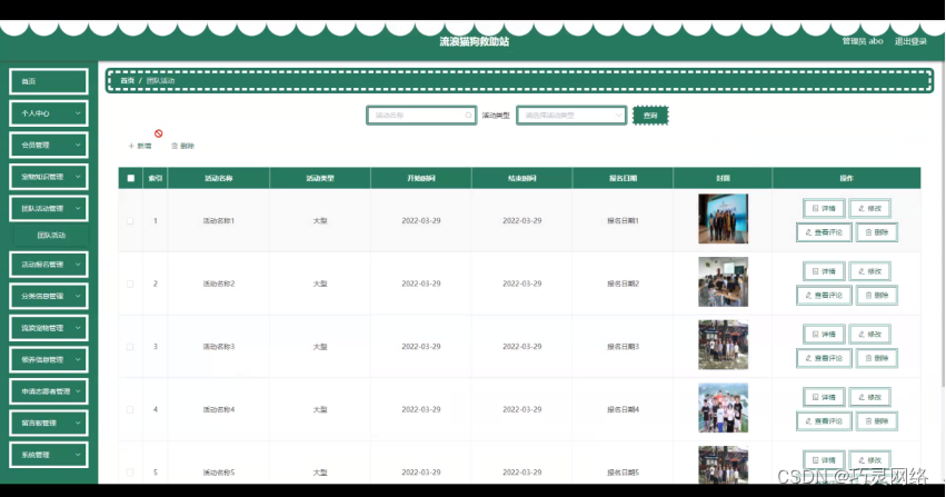 团队活动管理,在团队活动管理页面可以对索引,活动名称,活动类型,开始时间,结束时间,报名日期,封面等内容进行详情、修改,查看评论和删除等操作,如图5-9所示。