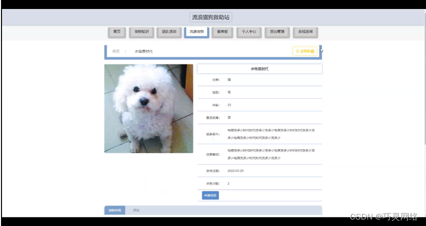 流浪宠物,在流浪宠物页面可以查看宠物名称,分类,性别,年龄,是否绝育,领养条件,注意事项,发布日期,点击次数等详细内容,并进行收藏,评论和申请领养操作;如图5-3所示。