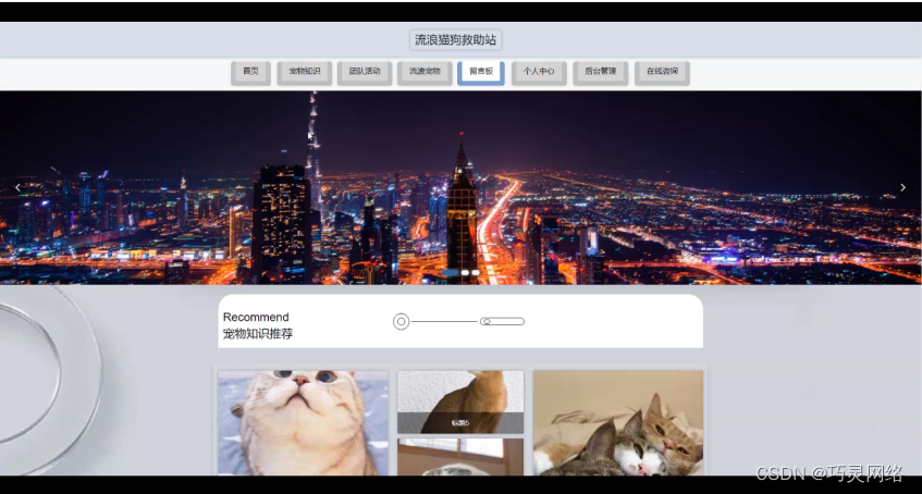 系统首页页面主要包括首页,宠物知识,团队活动,流浪宠物,留言板,个人中心,后台管理,在线咨询等内容,并根据需要进行详细操作;如图5-1所示: