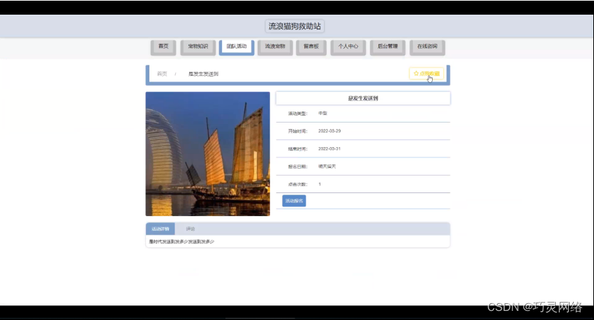 团队活动,在团队活动页面可以查看活动名称,活动类型,开始时间,结束时间,报名时间,点击次数等内容,并进行评论,收藏和活动报名操作;如图5-4所示。