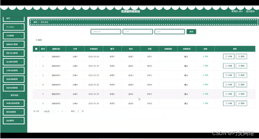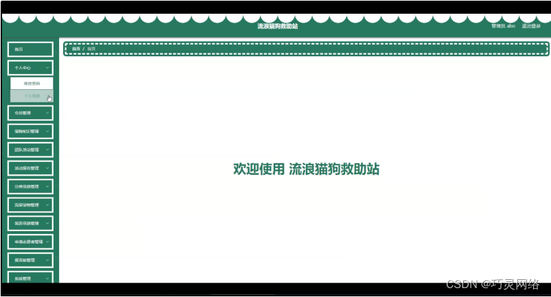 管理员登录系统后,可以对首页,个人中心,会员管理,宠物知识管理,团队活动管理,活动报名管理,分类信息管理,流浪宠物管理,领养信息管理,申请志愿者管理,留言板管理,系统管理等功能进行相应的操作管理,如图5-6所示。
