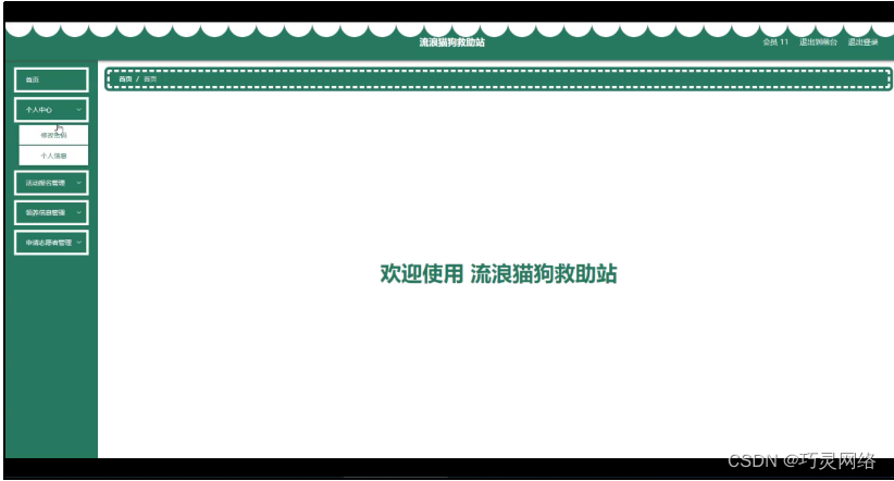 会员登录进入流浪猫狗救助站可以对首页,个人中心,活动报名管理,领养信息管理,申请志愿者管理等功能进行相应操作,如图5-13所示。