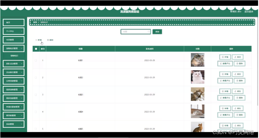 宠物知识管理,在宠物知识管理页面可以对索引,标题,发布时间,封面等内容进行详情,修改,查看评论和删除等操作,如图5-8所示。