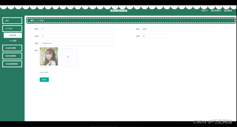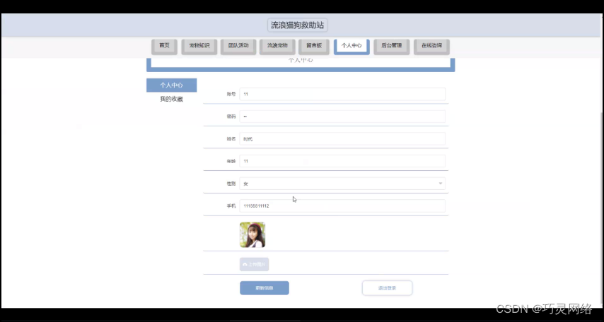 个人中心,在个人中心页面可以通过填写账号,姓名,年龄,性别,手机,照片等信息进行修改操作;如图5-14所示。