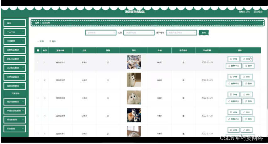 流浪宠物管理,在流浪宠物管理页面可以对索引,宠物名称,分类,性别,图片,年龄,是否绝育,发布日期等内容进行详情,修改,查看评论和删除等操作,如图5-11所示。
