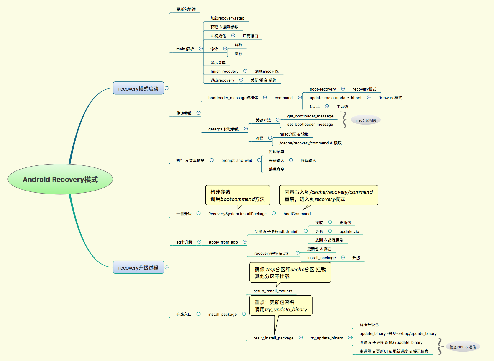 导图是不断迭代的,这里主要关注➕ recovery升级过程部分即可,主要从 一般升级和sd卡升级角度分析了如何调用到关键方法installPackage,最后从升级入口installPackage解读如何其原理。