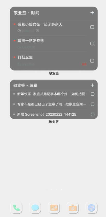 如果想要将提醒事项添加到桌面的话,我们可以直接长按手机桌面空白处,然后找到敬业签小组件进行添加。安卓手机用户可以找“时间”小组件提醒添加,添加到桌面的小组件是半透明状小贴纸,只显示有提醒时间的提醒事项(待办分类里的提醒事项也会显示),我们手指放在小组件事项上向上滑动,就可以看到下方未显示的提醒事项了。