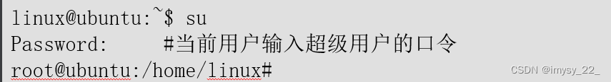 su命令用于临时改变用户身份,具有其他用户的权限。普通用户可以使用su命令临时具有超级用户的权限;超级用户也可以使用普通用户身份完成一些操作。当需要放弃当前用户身份,可以使用exit命令切换回来。su命令的一般语法格式为: