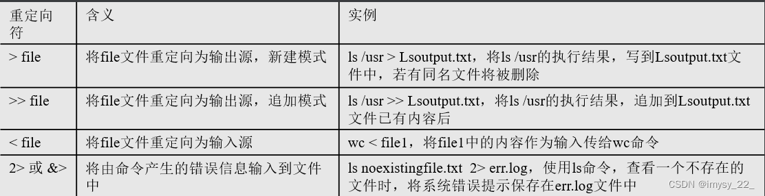 输入/输出重定向是改变shell命令或程序默认的标准输入/输出目标,重新定向到新的目标。