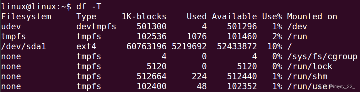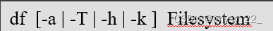 df命令用于查看磁盘空间的使用情况。查看磁盘空间是用户应当经常做的事情,因为谁也不希望看到根或/var分区在不经意间填满,以便及时清理。df命令的一般格式为:![]()