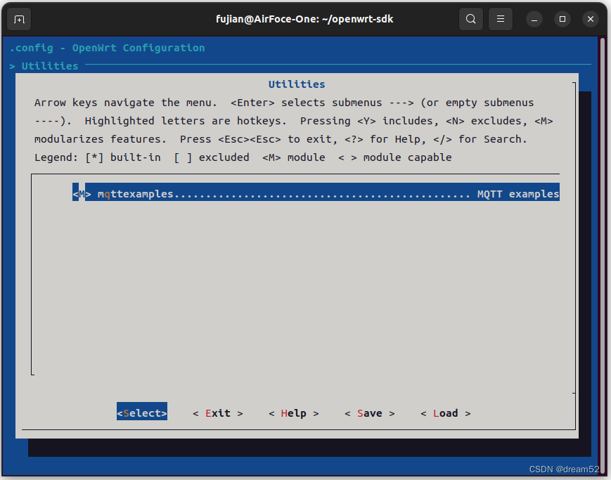 mqttexamples.c文件 上面有,这里就不贴了。把文件按上面的目录结构组织好,把它放到openwrt-sdk/package目录中,之后,终端在openwrt-sdk目录下,make menuconfig 一下,看看mqttexamples是不是出现在上面了。