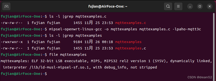 进行编译,编译成功后用 file mqttexamples 查看编译出来的文件信息。