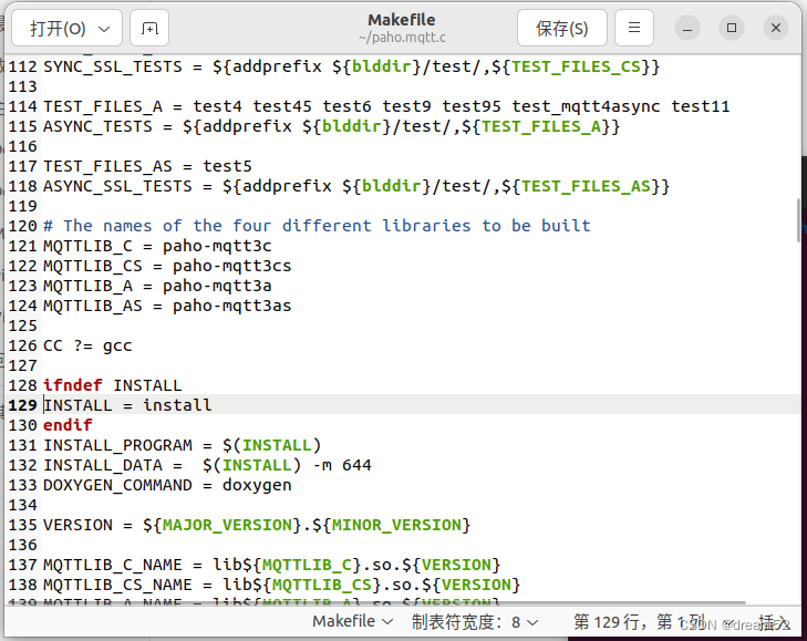 终端进入到之前克隆好的paho.mqtt.c目录中,gedit Makefile 修改Makefile。