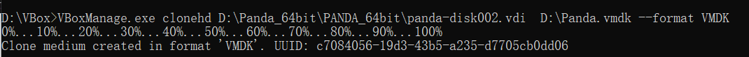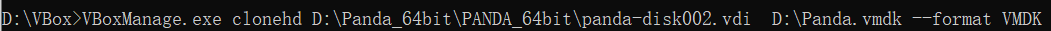 VBoxManage.exe clonehd "vdi文件(要包括其所在位置)" "vmdk文件(输入你想要存储的vmdk位置以及名字)" --format VMDK