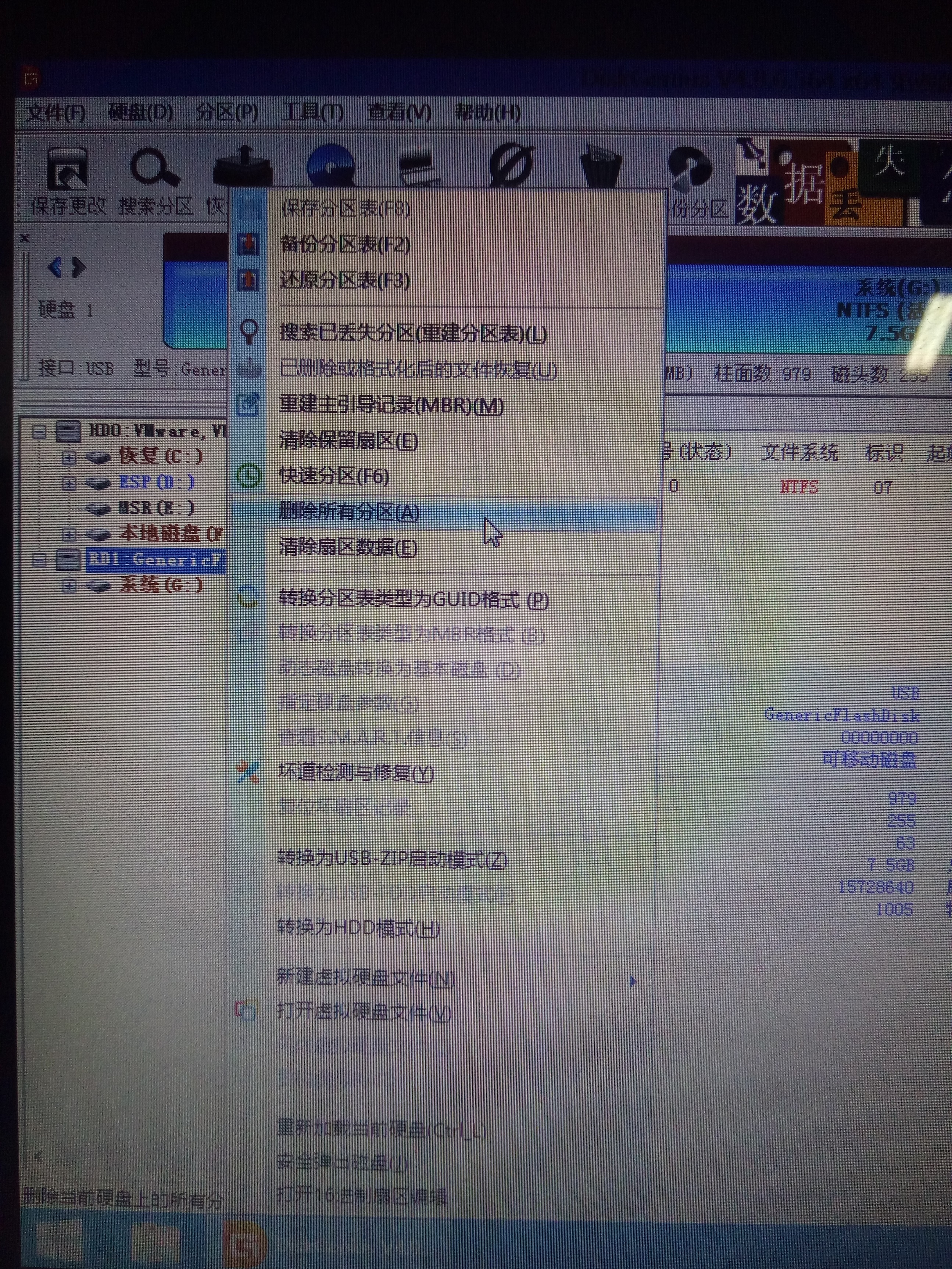 3、选中磁盘,右键,删除所有分区。