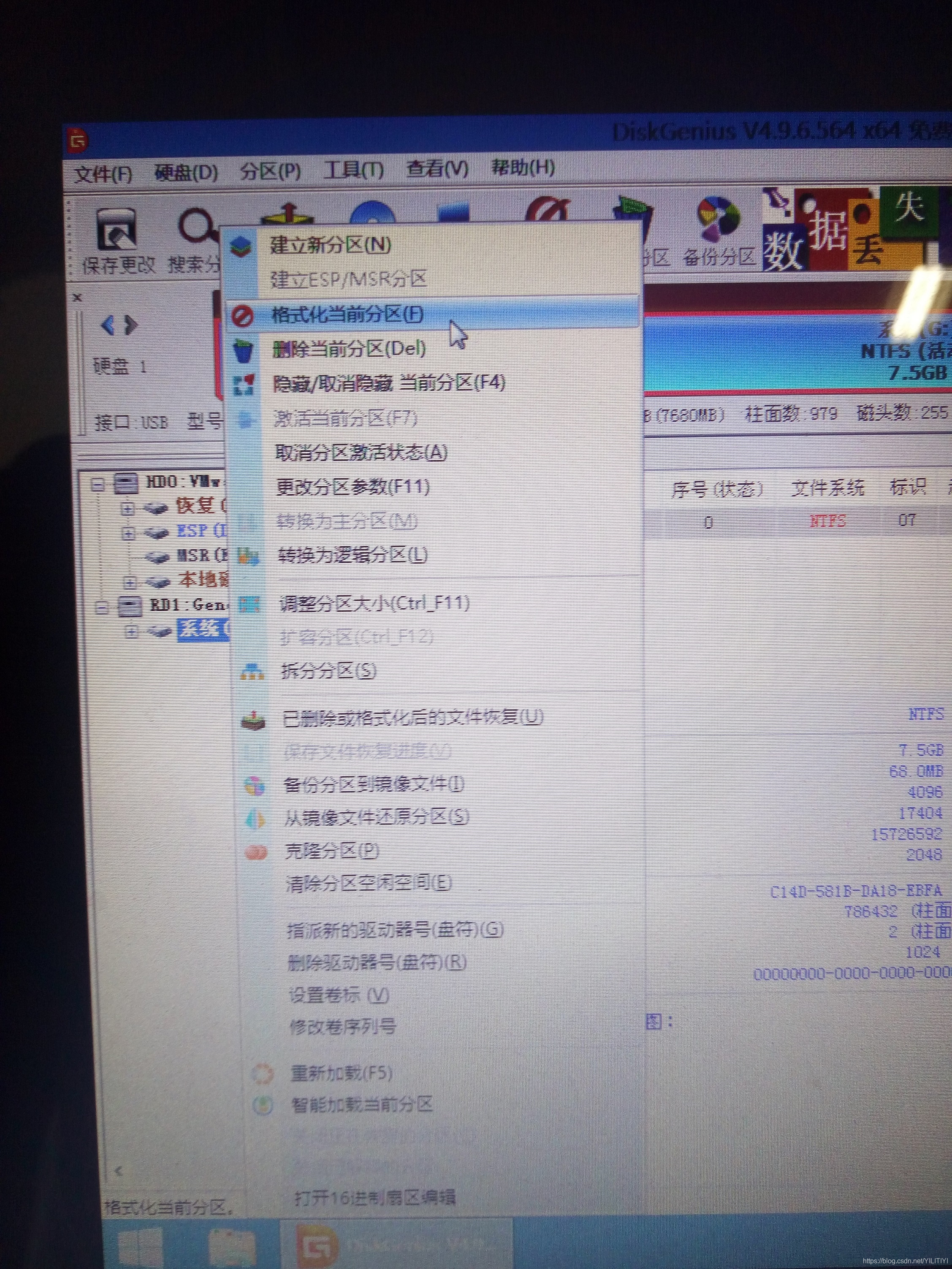 5、快速分区后,选择格式化当前分区,最好选择较靠后的驱动器号。