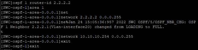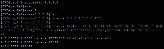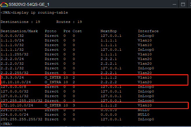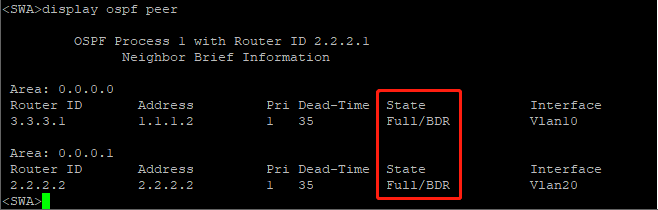 上图已可看到此时SWB已通过vlan10与SWA(1.1.1.1)建立起邻居且状态以达到”FULL“。