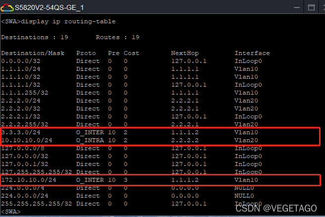 上图可看出SWA已学习到拓扑内所有网段路由信息。