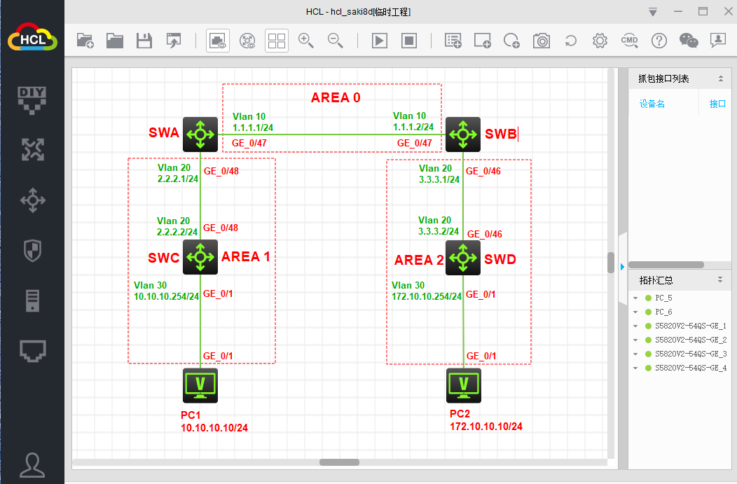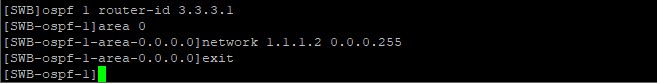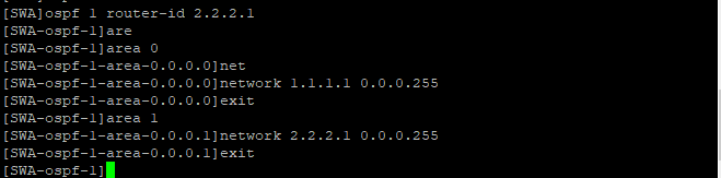 注:1、由于SWC两个网段均在AREA 1中,所以这里AREA 1同时发布两个网段。SWD也一样。