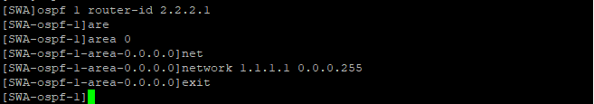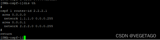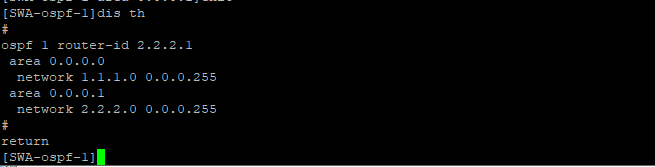 (查看下当前设备ospf配置,可见刚才发布的1.1.1.1/24和2.2.2.1/24已经自动汇总成1.1.1.0/24和2.2.2.0/24,因为上面发布的是一个网段,而本实验暂且没有采用ospf精简发布)