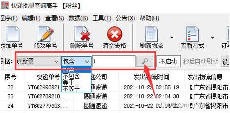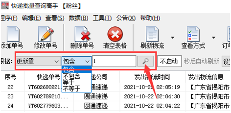 想要分析揽收后没有物流的单号,可以根据:更新量、包含1来搜索