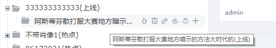 var editStr = ` `;spanObj.append(editStr);if(treeNode.isHover){//这里是核心代码,遇到一个贼大的坑,搞了两天,hover上去之后,图标可以显示出来,但是如果是点击某一个节点,再将鼠标移入到别的dom结构,会发现小图标不会出现,isHover是节点自带属性,hover上去的时候,给a标签设置hover属性,然后给a绑定一个鼠标离开事件, 设置鼠标从节点移出时,删除由 addHoverDom 增加的按钮aObj.css({'backgroundColor':'#F6F7F8','display':'inline-block','width':'95%','min-width':'225px','padding':'3.5px 0'});aObj.on('mouseleave',function(){_this.removehoverdom(null,treeNode);});}//$("#diyBtnGroup").css({'backgroundColor':'red'});var bObj = $("#" + treeNode.tId + "_icon"); // 获取节点 dombObj.css({'vertical-align':'inherit'});//避免鼠标浮上去之后,发生抖动(巨大一个坑,也搞了两天)var btnHot = $('#diyBtn_'+treeNode.id + '_hot');var btnDelete = $('#diyBtn_'+treeNode.id + '_delete');var btnModify = $('#diyBtn_'+treeNode.id + '_modify');var btnAdd = $('#diyBtn_'+treeNode.id + '_add');var btnOffline = $('#diyBtn_'+treeNode.id + '_offline');var btnOnline = $('#diyBtn_'+treeNode.id + '_online');// 小图标点击事件if (btnDelete) btnDelete.bind("click", function (){_this.delete(treeNode)});if (btnAdd) btnAdd.bind("click", function (){_this.add(treeNode)});if (btnModify) btnModify.bind("click", function (){_this.modify(treeNode)});if (btnHot) btnHot.bind("click", function (){_this.hot(treeNode)});if (btnOffline) btnOffline.bind("click", function (){_this.offline(treeNode)});if (btnOnline) btnOnline.bind("click", function (){_this.online(treeNode)}); // 小图标hover事件if (btnDelete) btnDelete.bind("mouseover", function (e){_this.deleteiconhover(treeNode,e)});if (btnAdd) btnAdd.bind("mouseover", function (e){_this.addiconhover(treeNode,e)});if (btnModify) btnModify.bind("mouseover", function (e){_this.modifyiconhover(treeNode,e)});if (btnHot) btnHot.bind("mouseover", function (e){_this.hoticonhover(treeNode,e)});if (btnOffline) btnOffline.bind("mouseover", function (e){_this.offlineiconhover(treeNode,e)});if (btnOnline) btnOnline.bind("mouseover", function (e){_this.onlineiconhover(treeNode,e)}); // 鼠标离开事件if (btnDelete) btnDelete.bind("mouseleave", function (){_this.deleteiconleave(treeNode)});if (btnAdd) btnAdd.bind("mouseleave", function (){_this.addiconleave(treeNode)});if (btnModify) btnModify.bind("mouseleave", function (){_this.modifyiconleave(treeNode)});if (btnHot) btnHot.bind("mouseleave", function (){_this.hoticonleave(treeNode)});if (btnOffline) btnOffline.bind("mouseleave", function (){_this.offlineiconleave(treeNode)});if (btnOnline) btnOnline.bind("mouseleave", function (){_this.onlineiconleave(treeNode)});},