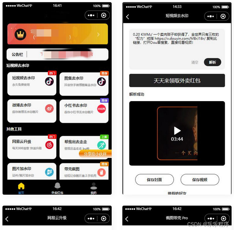 【免费】简约黑色多功能去水印外卖小程序源码带流量主(亲测)