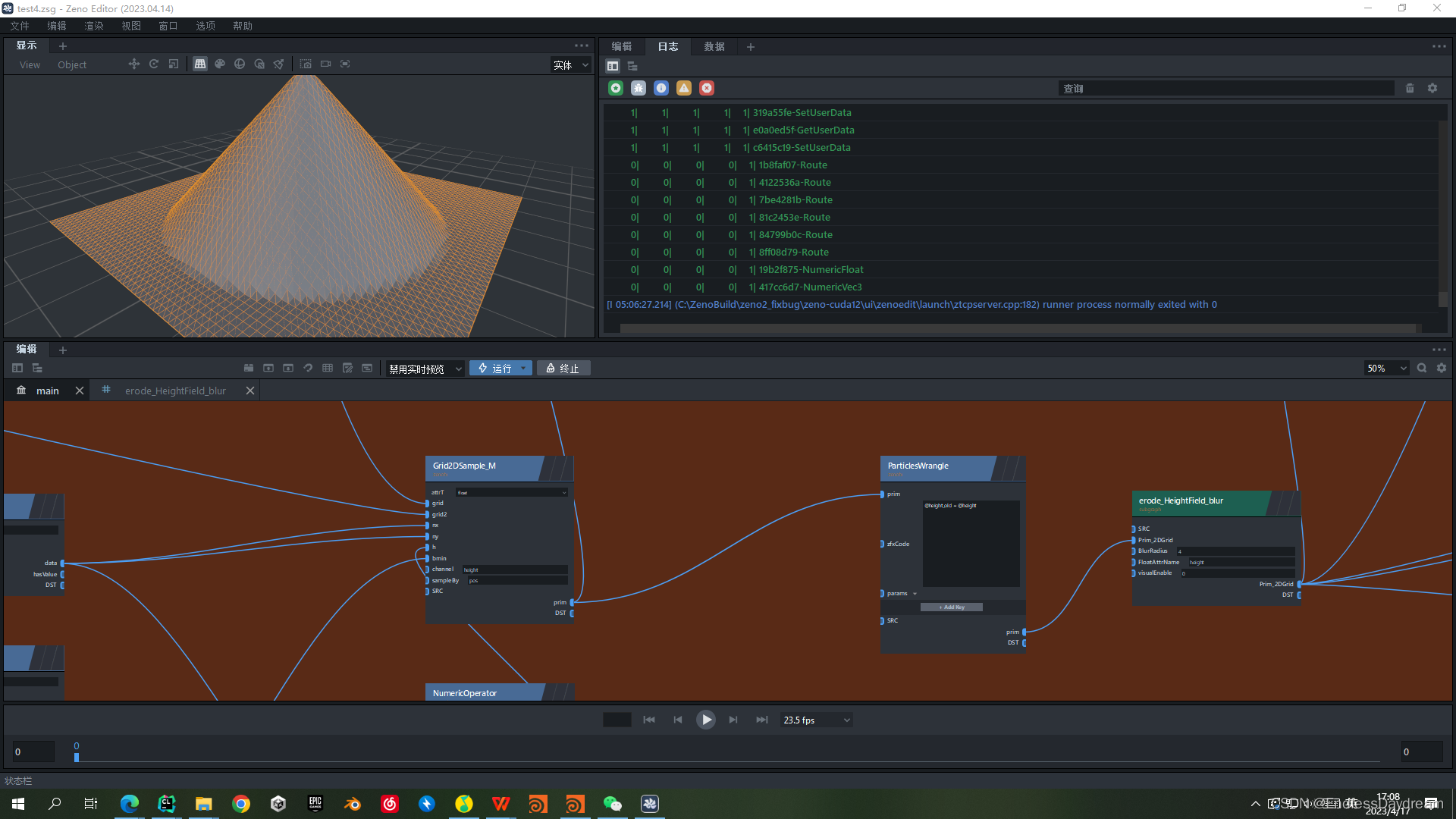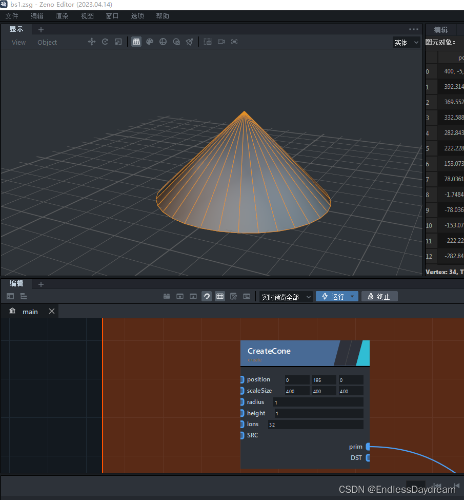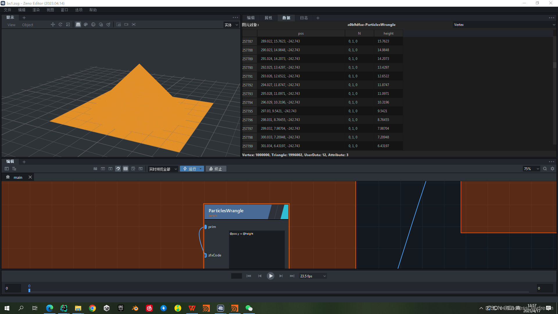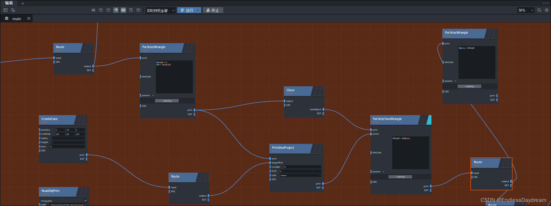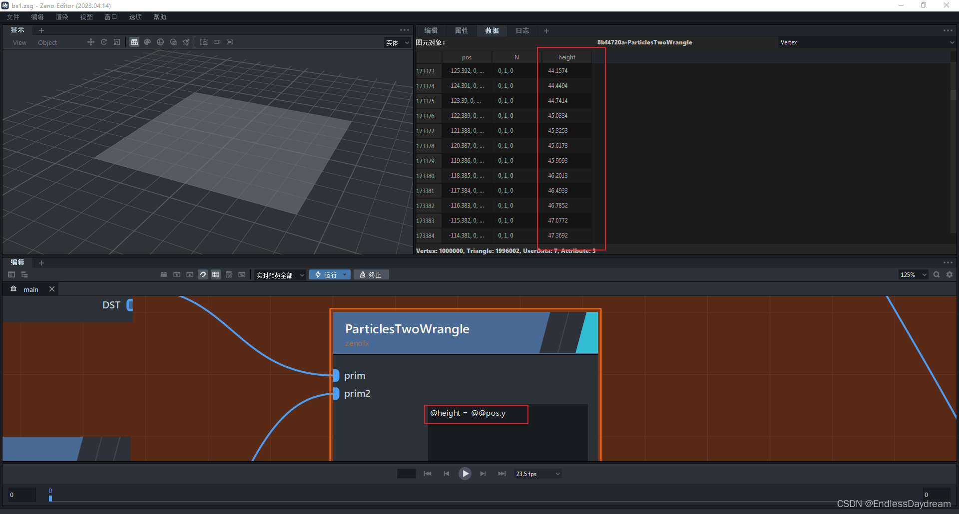 利用ParticlesTwoWrangle将圆锥的y值赋给平面的height属性