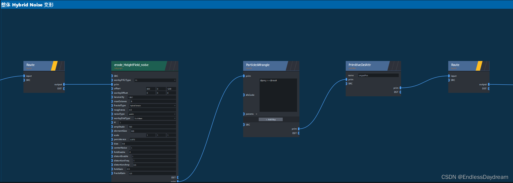 }struct erode_noise_perlin : INode {void apply() override {auto terrain = get_input("prim_2DGrid");auto attrName = get_param("attrName");auto attrType = get_param("attrType");if (!terrain->has_attr(attrName)) {if (attrType == "float3") terrain->add_attr(attrName);else if (attrType == "float") terrain->add_attr(attrName);}auto vec3fAttrName = get_input("vec3fAttrName")->get();if (!terrain->verts.has_attr(vec3fAttrName)){zeno::log_error("no such data named '{}'.", vec3fAttrName);}auto& vec3fAttr = terrain->verts.attr(vec3fAttrName);terrain->attr_visit(attrName, [&](auto& arr) {