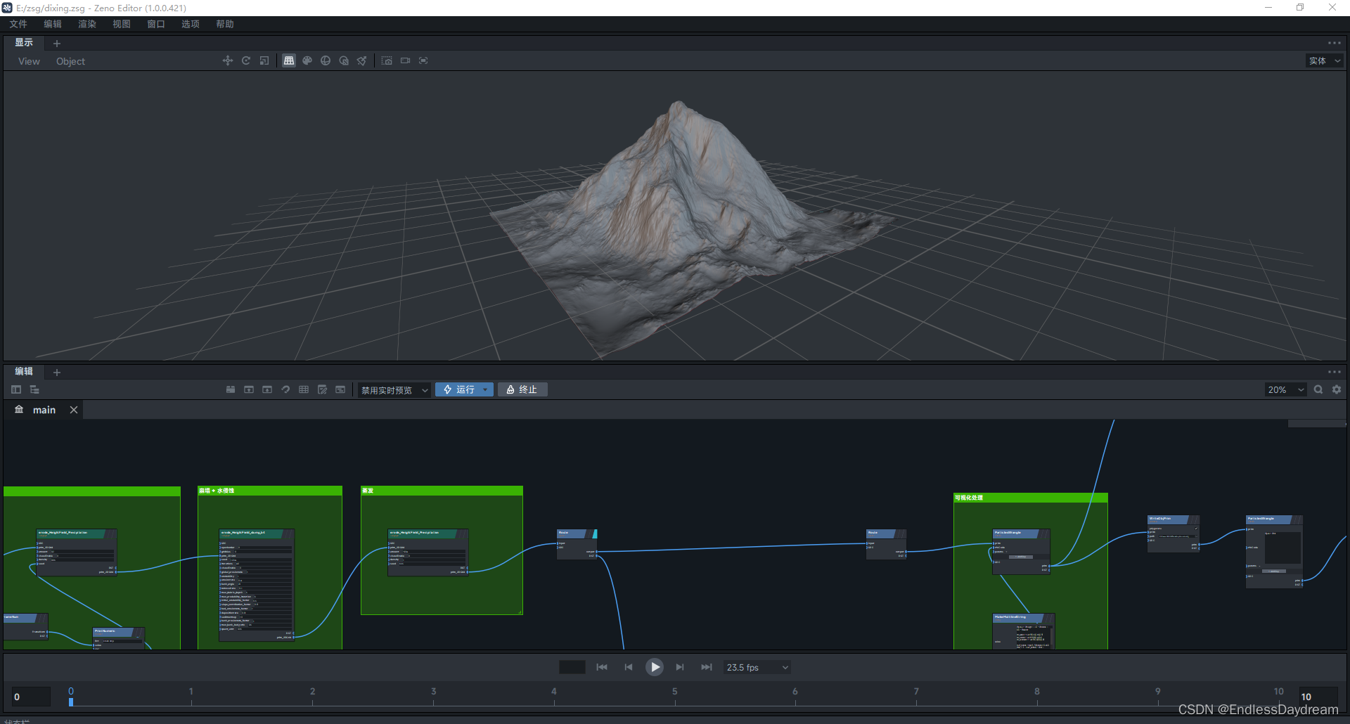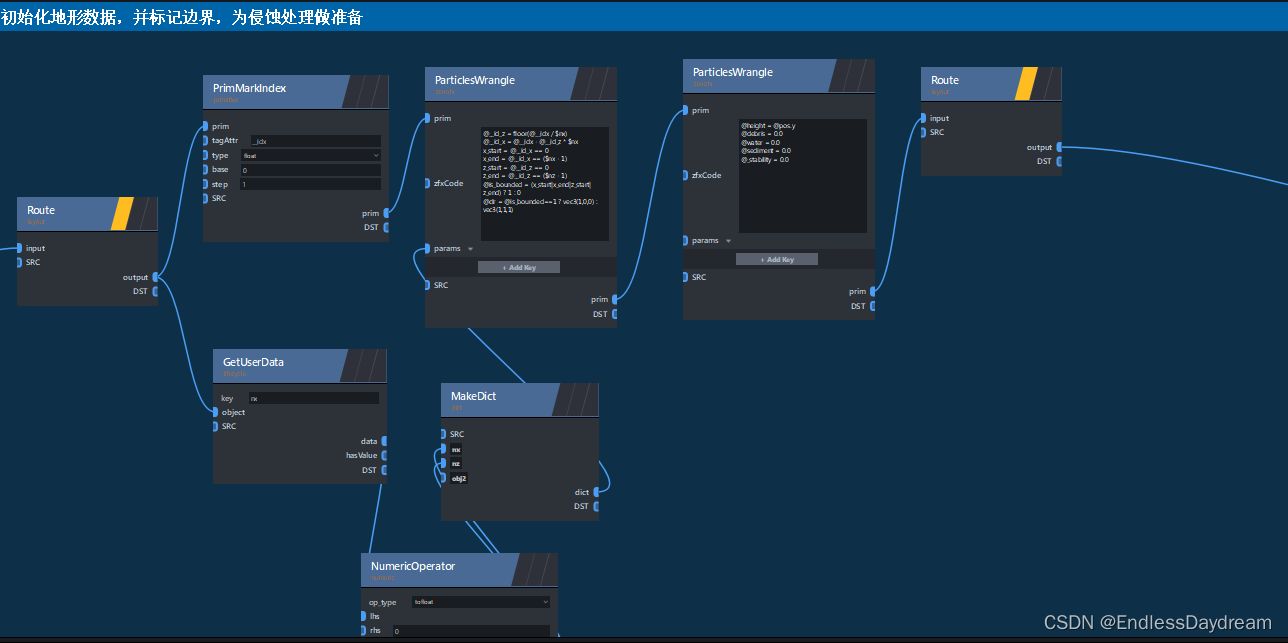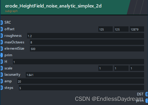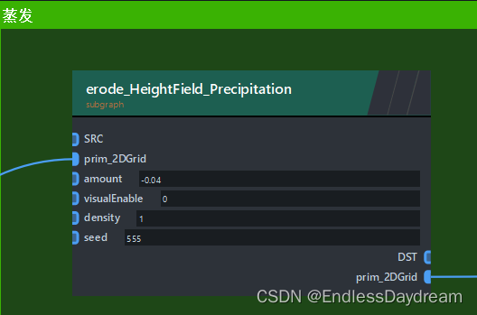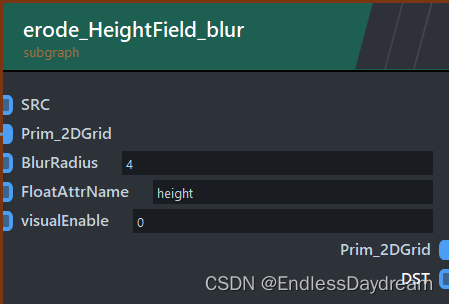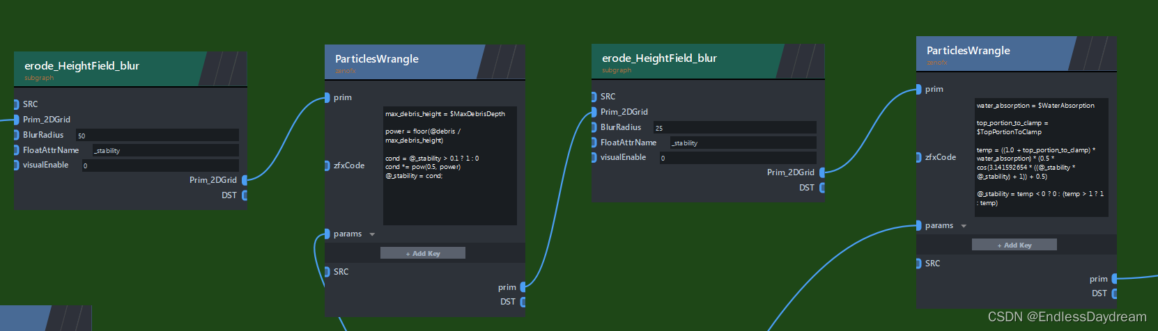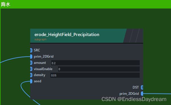 ZENDEFNODE(erode_tumble_material_v4,{ /* inputs: */ {"prim_2DGrid",{"ListObject", "perm"},{"ListObject", "p_dirs"},{"ListObject", "x_dirs"},{"float", "seed", "12.34"},{"int", "iterations", "40"}, // 流淌的总迭代次数{"int", "iter", "0"},{"int", "i", "0"},{"int", "openborder", "0"},{"float", "gridbias", "0.0"},{"int", "visualEnable", "0"},// 侵蚀主参数{"float", "global_erosionrate", "1.0"}, // 全局侵蚀率{"float", "erodability", "1.0"}, // 侵蚀能力{"float", "erosionrate", "0.4"}, // 侵蚀率{"float", "bank_angle", "70.0"}, // 河堤侵蚀角度// 高级参数{"float", "removalrate", "0.1"}, // 风化率/水吸收率{"float", "max_debris_depth", "5.0"}, // 碎屑最大深度// 侵蚀能力调整{"int", "max_erodability_iteration", "5"}, // 最大侵蚀能力迭代次数{"float", "initial_erodability_factor", "0.5"}, // 初始侵蚀能力因子{"float", "slope_contribution_factor", "0.8"}, // “地面斜率”对“侵蚀”和“沉积”的影响,“地面斜率大” -> 侵蚀因子大,沉积因子小// 河床参数{"float", "bed_erosionrate_factor", "1.0"}, // 河床侵蚀率因子{"float", "depositionrate", "0.01"}, // 沉积率{"float", "sedimentcap", "10.0"}, // 高度差转变为沉积物的比率 / 泥沙容量,每单位流动水可携带的泥沙量// 河堤参数{"float", "bank_erosionrate_factor", "1.0"}, // 河堤侵蚀率因子{"float", "max_bank_bed_ratio", "0.5"}, // 高于这个比值的河岸将不会在侵蚀中被视为河岸,会停止侵蚀// 河网控制{"float", "quant_amt", "0.05"}, // 流量维持率,越高河流流量越稳定}, /* outputs: */ {"prim_2DGrid",}, /* params: */ {}, /* category: */ {"erode",} });