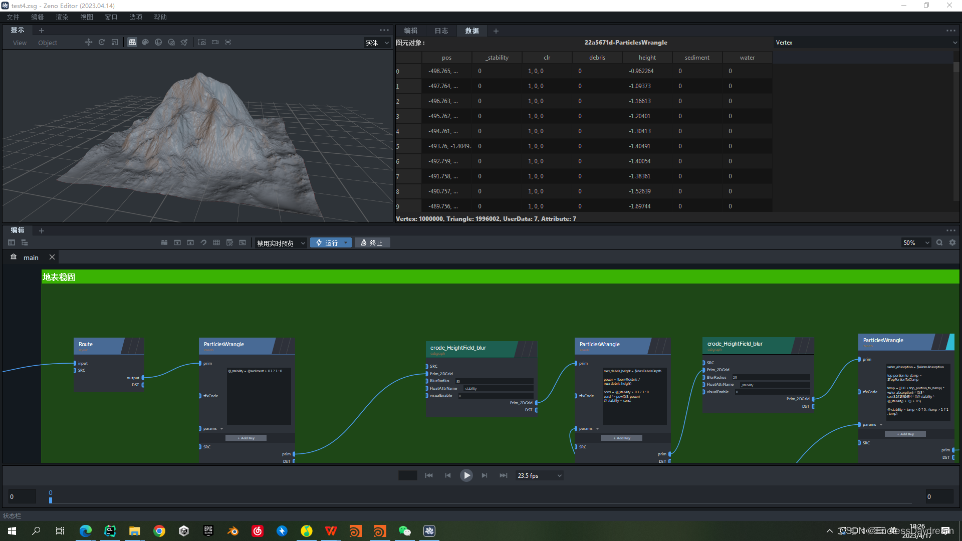 struct erode_tumble_material_v2 : INode {void apply() override {// 地面网格标准处理过程// 获取地形auto terrain = get_input("prim_2DGrid");// 获取用户数据,里面存有网格精度int nx, nz;auto& ud = terrain->userData();if ((!ud.has("nx")) || (!ud.has("nz"))){zeno::log_error("no such UserData named '{}' and '{}'.", "nx", "nz");}nx = ud.get2("nx");nz = ud.get2("nz");// 获取网格大小,目前只支持方格auto& pos = terrain->verts;float cellSize = std::abs(pos[0][0] - pos[1][0]);// 用于调试和可视化auto visualEnable = get_input("visualEnable")->get();// if (visualEnable) {if (!terrain->verts.has_attr("clr")){auto& _clr = terrain->verts.add_attr("clr");std::fill(_clr.begin(), _clr.end(), vec3f(1.0, 1.0, 1.0));}auto& attr_color = terrain->verts.attr("clr");if (!terrain->verts.has_attr("debug")){auto& _debug = terrain->verts.add_attr("debug");std::fill(_debug.begin(), _debug.end(), 0);}auto& attr_debug = terrain->verts.attr("debug");// }///auto gridbias = get_input("gridbias")->get();auto repose_angle = get_input("repose_angle")->get();auto quant_amt = get_input("quant_amt")->get();auto flow_rate = get_input("flow_rate")->get();///std::uniform_real_distribution distr(0.0, 1.0);auto seed = get_input("seed")->get();auto iterations = get_input("iterations")->get();auto iter = get_input("iter")->get();auto i = get_input("i")->get();auto openborder = get_input("openborder")->get();auto perm = get_input("perm")->get2();auto p_dirs = get_input("p_dirs")->get2();auto x_dirs = get_input("x_dirs")->get2();// 计算用的临时属性,必须要有if (!terrain->verts.has_attr("height") ||!terrain->verts.has_attr("_stability") ||!terrain->verts.has_attr("_material") ||!terrain->verts.has_attr("_temp_material")){// height 和 debris 数据要从外面读取,所以属性中要有 height 和 debriszeno::log_error("Node [erode_tumble_material_v2], no such data layer named '{}' or '{}' or '{}' or '{}'.","height", "_stability", "_material", "_temp_material");}auto& height = terrain->verts.add_attr("height");auto& stabilitymask = terrain->verts.add_attr("_stability");auto& _material = terrain->verts.add_attr("_material");auto& _temp_material = terrain->verts.add_attr("_temp_material");// 计算// 新的,确定的,随机方向,依据上次的计算结果进行计算