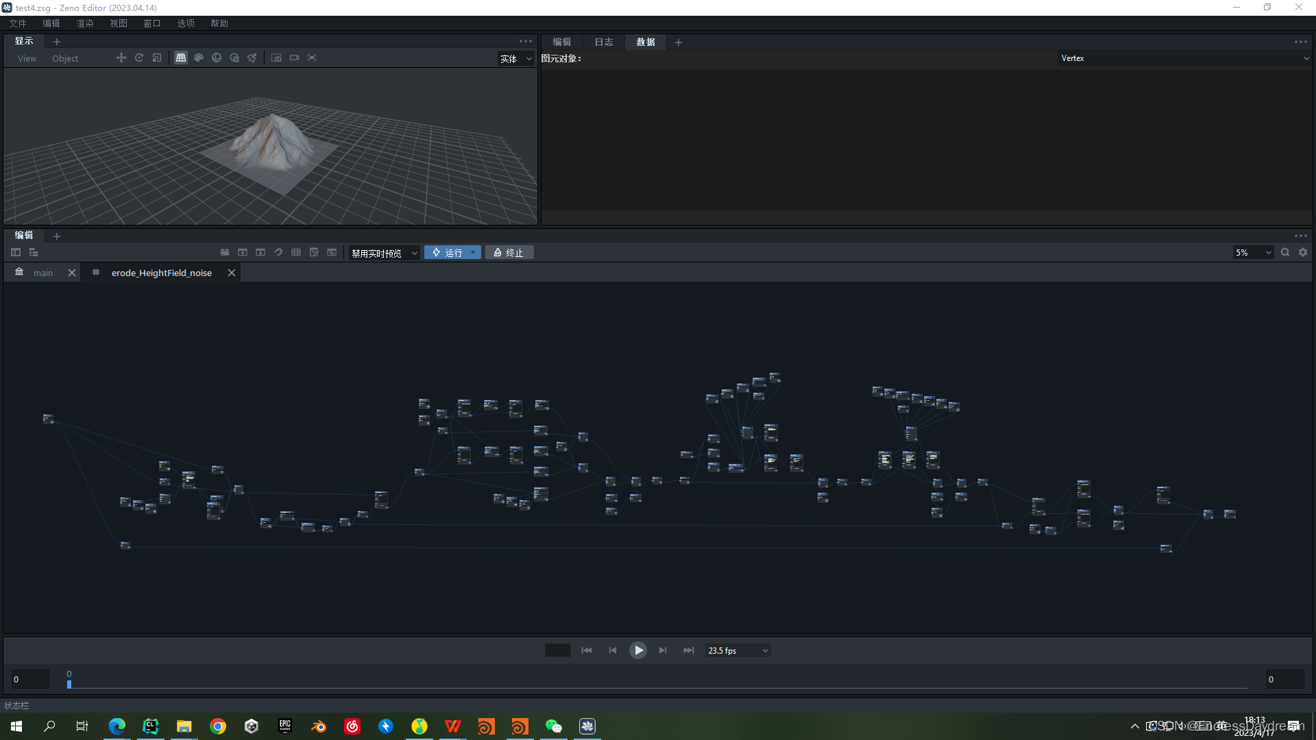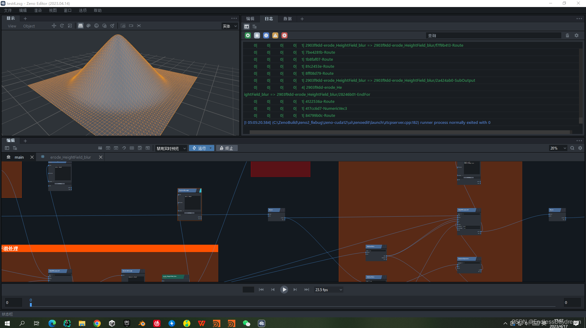 struct erode_tumble_material_v0 : INode {void apply() override {// 地面网格标准处理过程// 获取地形auto terrain = get_input("prim_2DGrid");// 获取用户数据,里面存有网格精度int nx, nz;auto& ud = terrain->userData();if ((!ud.has("nx")) || (!ud.has("nz"))){zeno::log_error("no such UserData named '{}' and '{}'.", "nx", "nz");}nx = ud.get2("nx");nz = ud.get2("nz");// 获取网格大小,目前只支持方格auto& pos = terrain->verts;float cellSize = std::abs(pos[0][0] - pos[1][0]);// 用于调试和可视化auto visualEnable = get_input("visualEnable")->get();// if (visualEnable) {if (!terrain->verts.has_attr("clr")){auto& _clr = terrain->verts.add_attr("clr");std::fill(_clr.begin(), _clr.end(), vec3f(1.0, 1.0, 1.0));}auto& attr_color = terrain->verts.attr("clr");if (!terrain->verts.has_attr("debug")){auto& _debug = terrain->verts.add_attr("debug");std::fill(_debug.begin(), _debug.end(), 0);}auto& attr_debug = terrain->verts.attr("debug");// }///auto gridbias = get_input("gridbias")->get();auto cut_angle = get_input("cut_angle")->get();auto global_erosionrate = get_input("global_erosionrate")->get();auto erosionrate = get_input("erosionrate")->get();auto erodability = get_input("erodability")->get();auto removalrate = get_input("removalrate")->get();auto maxdepth = get_input("maxdepth")->get();///std::uniform_real_distribution distr(0.0, 1.0); // 设置随机分布auto seed = get_input("seed")->get();auto iterations = get_input("iterations")->get(); // 外部迭代总次数 10auto iter = get_input("iter")->get(); // 外部迭代当前次数 1~10auto i = get_input("i")->get(); // 内部迭代当前次数 0~7auto openborder = get_input("openborder")->get(); // 获取边界标记auto perm = get_input("perm")->get2();auto p_dirs = get_input("p_dirs")->get2();auto x_dirs = get_input("x_dirs")->get2();// 计算用的临时属性,必须要有if (!terrain->verts.has_attr("_height") ||!terrain->verts.has_attr("_debris") ||!terrain->verts.has_attr("_temp_height") ||!terrain->verts.has_attr("_temp_debris")){// height 和 debris 数据要从外面读取,所以属性中要有 height 和 debriszeno::log_error("Node [erode_tumble_material_v0], no such data layer named '{}' or '{}' or '{}' or '{}'.","_height", "_debris", "_temp_height", "_temp_debris");}auto& _height = terrain->verts.attr("_height"); // 计算用的临时属性auto& _debris = terrain->verts.attr("_debris");auto& _temp_height = terrain->verts.attr("_temp_height"); // 备份用的临时属性auto& _temp_debris = terrain->verts.attr("_temp_debris");// 计算// 新的,确定的,随机方向,依据上次的计算结果进行计算