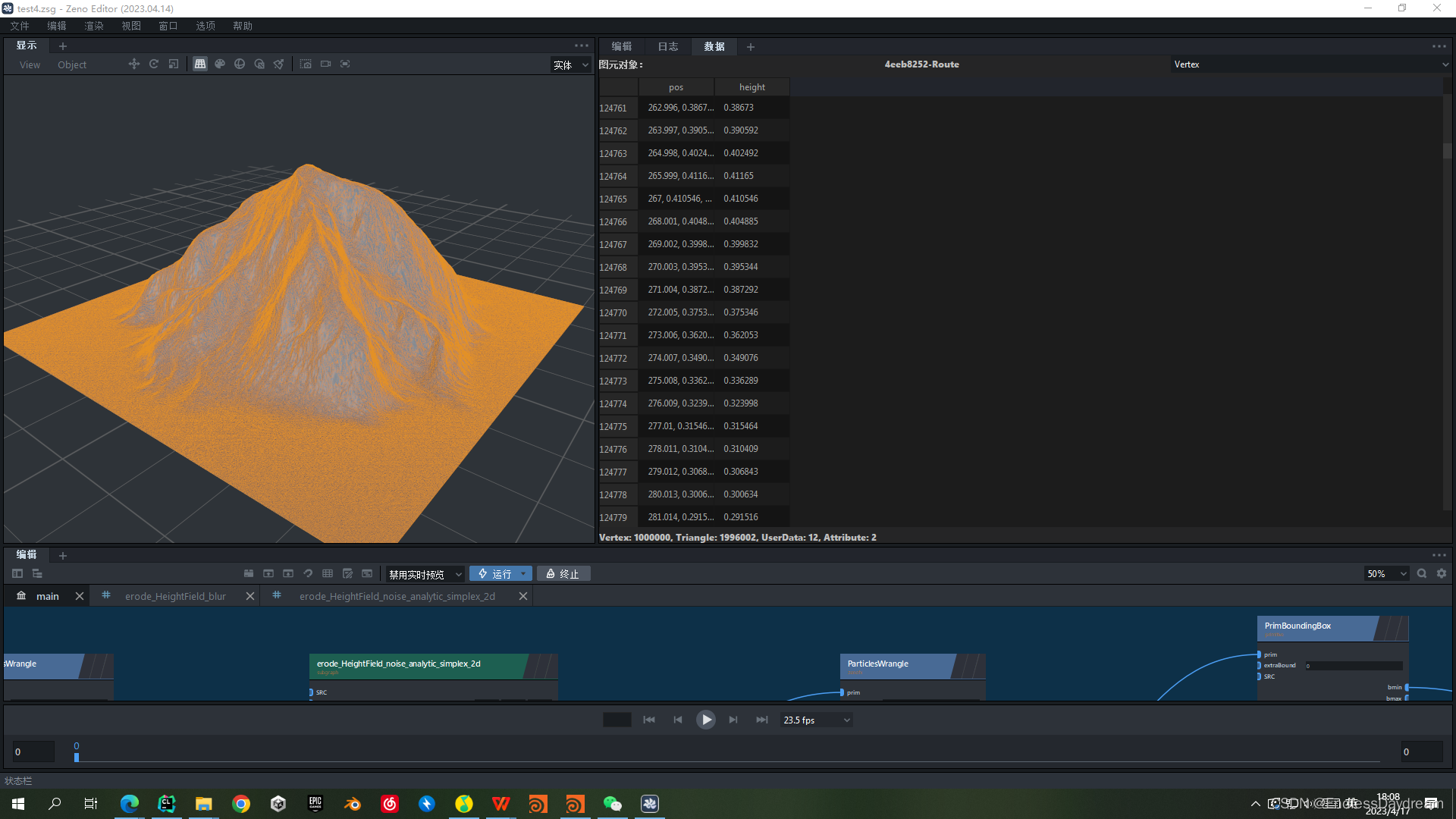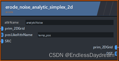 struct erode_noise_analytic_simplex_2d : INode {void apply() override {auto terrain = get_input("prim_2DGrid");auto attrName = get_param("attrName");if (!terrain->has_attr(attrName)) {terrain->add_attr(attrName);}auto& noise = terrain->verts.attr(attrName);auto posLikeAttrName = get_input("posLikeAttrName")->get();if (!terrain->verts.has_attr(posLikeAttrName)){zeno::log_error("no such data named '{}'.", posLikeAttrName);}auto& pos = terrain->verts.attr(posLikeAttrName);glm::vec3 ret{};// = glm::vec3(0, 0, 0);