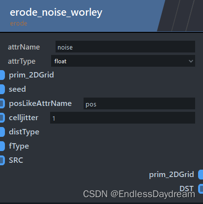 ZENDEFNODE(erode_noise_worley,{ /* inputs: */ {"prim_2DGrid","seed",{"enum Euclidean Chebyshev Manhattan", "distType", "Euclidean"},{"enum F1 F2-F1", "fType", "F1"},}, /* outputs: */ {"prim_2DGrid",}, /* params: */ {{"string", "attrName", "noise"},{"enum float float3", "attrType", "float"},}, /* category: */ {"erode",} });