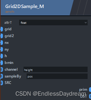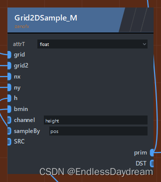 ZENDEFNODE(Grid2DSample, {{{"PrimitiveObject", "grid"},{"int", "nx","1"},{"int", "ny", "1"},{"float", "h", "1"},{"vec3f","bmin", "0,0,0" },{"string", "channel", "pos"},{"string", "sampleBy", "pos"}},{{"PrimitiveObject", "prim"}},{{"enum vec3 float", "attrT", "float"},},{"zenofx"},});