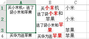 color = workbook.add_format({'bold': True, 'color': 'red'})def ner(text):for clause in text.split(','): # 切句for word, head, tail in tokenize(clause): # 分词+位置if word in {'小米', '苹果'}: # NERyield ([i for i in(clause[:head], color, word, clause[tail:])if i],word,)texts = ['买小米机,送了袋小米和苹果', '诺基亚', '买华为送苹果']