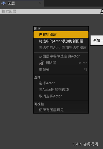 ●在图层视口,点击鼠标右键,可以创建空图层,也可以将选中的Actor添加到新图层,或者将选中的Actor添加到选中图层。