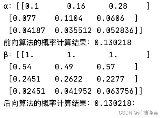 if __name__ == '__main__':from time import time# 课本例子10.2pi = [0.2, 0.4, 0.4]a = np.array([[0.5, 0.2, 0.3],[0.3, 0.5, 0.2],[0.2, 0.3, 0.5]])b = np.array([[0.5, 0.5],[0.4, 0.6],[0.7, 0.3]])O = ['红', '白', '红']f = FB(pi=pi, A=a, B=b, V=['红', '白'])# start = time()resf = f.forward(O)resb = f.backward(O)# print(time()-start)print('α:{}\n前向算法的概率计算结果:{}'.format(resf, f.cal_prob(O, opt='f')))print('β:{}\n后向算法的概率计算结果:{}:'.format(resb, f.cal_prob(O, opt='b')))