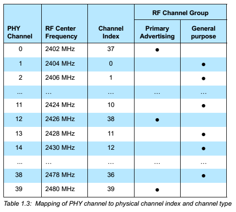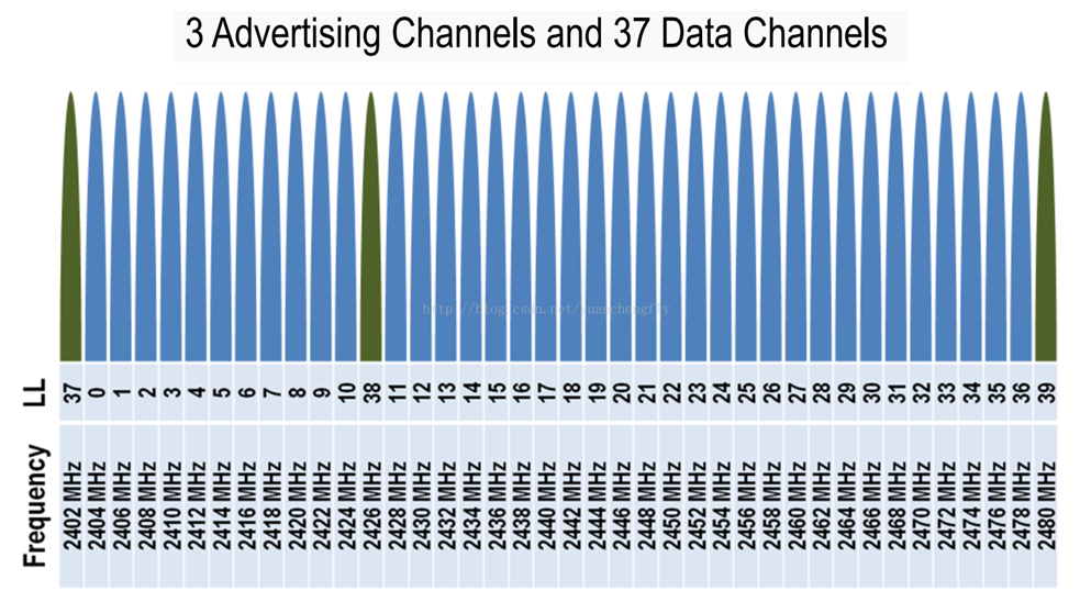 BLE的频分复用体现在:BLE总划分了40个信道,每个信道中心频率间隔2Mhz。40个信道中有3个用于数据广播,其余37个用于一般通信用途。