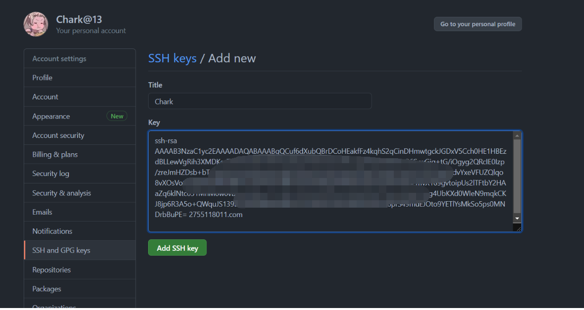 把id_rsa.pub文件里的全部内容粘贴复制到GitHub上,Title为标题,随意填写,然后点击Add SSH key即可