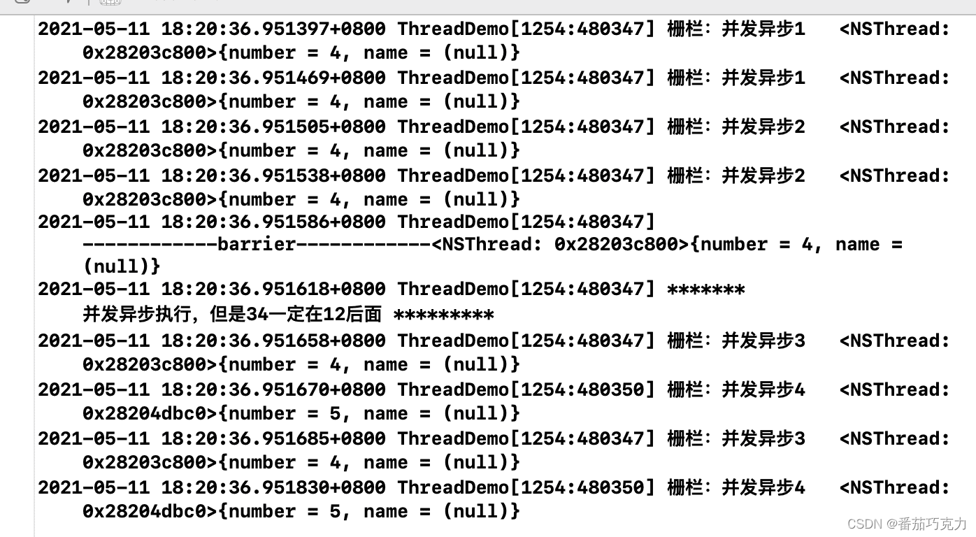 // 并发队列dispatch_queue_t queue = dispatch_queue_create("test", DISPATCH_QUEUE_CONCURRENT);// 异步执行dispatch_async(queue, ^{for (int i = 0; i < 2; i++) {NSLog(@"栅栏:并发异步1 %@",[NSThread currentThread]);}});dispatch_async(queue, ^{for (int i = 0; i < 2; i++) {NSLog(@"栅栏:并发异步2 %@",[NSThread currentThread]);}});dispatch_barrier_async(queue, ^{NSLog(@"------------barrier------------%@", [NSThread currentThread]);NSLog(@"******* 并发异步执行,但是34一定在12后面 *********");});dispatch_async(queue, ^{for (int i = 0; i < 2; i++) {NSLog(@"栅栏:并发异步3 %@",[NSThread currentThread]);}});dispatch_async(queue, ^{for (int i = 0; i < 2; i++) {NSLog(@"栅栏:并发异步4 %@",[NSThread currentThread]);}});