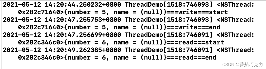 // 创建 原型sem_t *sem_open(const char *name,int oflag,mode_t mode,unsigned int value);// name 信号的外部名字// oflag 选择创建或打开一个现有的信号灯// mode 权限位// value 信号初始值sem_t *sem = sem_open("semname", O_CREAT, 0644, 1);NSOperationQueue *queue = [[NSOperationQueue alloc] init];[queue addOperationWithBlock:^{sem_wait(sem); // 首先判断信号量value 如果=0则等待,否则value-1并正常往下走NSLog(@"%@===write===start",[NSThread currentThread]);sleep(3);NSLog(@"%@===write===end",[NSThread currentThread]);sem_post(sem); // 执行完发送信号,value+1}];[queue addOperationWithBlock:^{sem_wait(sem);NSLog(@"%@===read===start",[NSThread currentThread]);sleep(2);NSLog(@"%@===read===end",[NSThread currentThread]);sem_post(sem);}];