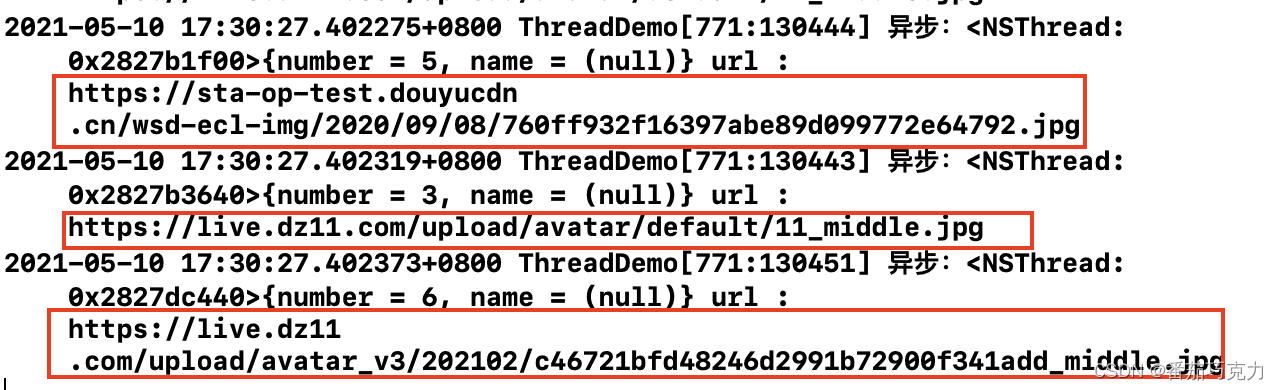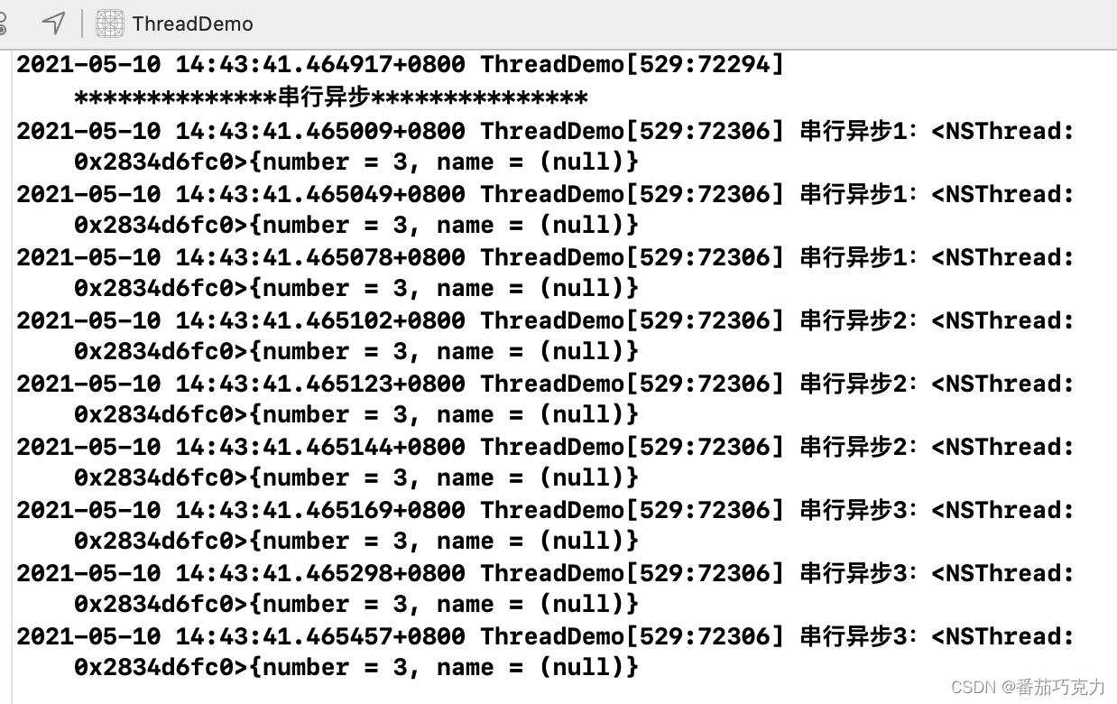 - (void)asyncSerial {NSLog(@"**************串行异步***************");dispatch_queue_t queue = dispatch_queue_create("test", DISPATCH_QUEUE_SERIAL);dispatch_async(queue, ^{for (int i=0;i<3;i++) {NSLog(@"串行异步1:%@", [NSThread currentThread]);}});dispatch_async(queue, ^{for (int i=0;i<3;i++) {NSLog(@"串行异步2:%@", [NSThread currentThread]);}});dispatch_async(queue, ^{for (int i=0;i<3;i++) {NSLog(@"串行异步3:%@", [NSThread currentThread]);}});