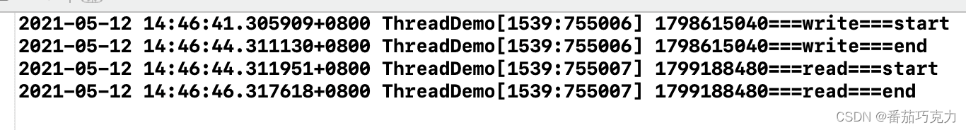 }void* readFunc(void *args) {pthread_join(thread1, NULL);NSLog(@"%u===read===start",(unsigned int)pthread_self());sleep(2);NSLog(@"%u===read===end",(unsigned int)pthread_self());return NULL;