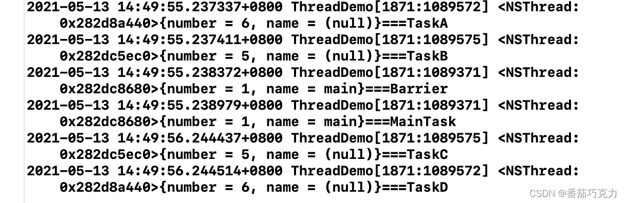 dispatch_queue_t queue = dispatch_queue_create("concurrent_queue", DISPATCH_QUEUE_CONCURRENT);dispatch_async(queue, ^{sleep(1);NSLog(@"%@===TaskA",[NSThread currentThread]);});dispatch_async(queue, ^{sleep(1);NSLog(@"%@===TaskB",[NSThread currentThread]);});// async不会阻塞当前线程(主线程)dispatch_barrier_async(queue, ^{NSLog(@"%@===Barrier",[NSThread currentThread]);});// sync会阻塞当前队列(主队列)// dispatch_barrier_sync(queue, ^{// NSLog(@"%@===Barrier",[NSThread currentThread]);// });dispatch_async(queue, ^{sleep(1);NSLog(@"%@===TaskC",[NSThread currentThread]);});dispatch_async(queue, ^{sleep(1);NSLog(@"%@===TaskD",[NSThread currentThread]);});NSLog(@"%@===MainTask",[NSThread currentThread]);