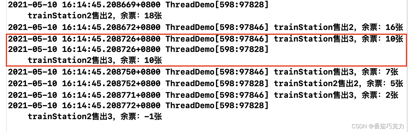 - (void)saleTickets:(dispatch_queue_t)queue{while (_restCount > 0) {@synchronized (self) {if (_restCount >0) {// 如果还有票,继续售卖NSInteger count = arc4random() % 3 + 1; // 在窗口购买任意n+1张票if (_restCount == 1){count = 1;}_restCount -= count; // 剩余票数const char *queueLabel = dispatch_queue_get_label(queue);NSString *label = [NSString stringWithUTF8String:queueLabel];NSLog(@"%@售出%ld,余票:%d张",label, (long)count, _restCount);}}}
