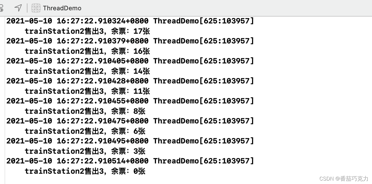 }- (void)saleTickets:(dispatch_queue_t)queue{while (_restCount > 0) {// 如果还有票,继续售卖NSInteger count = arc4random() % 3 + 1; // 在窗口购买任意n+1张票if (_restCount == 1){count = 1;}_restCount -= count; // 剩余票数const char *queueLabel = dispatch_queue_get_label(queue);NSString *label = [NSString stringWithUTF8String:queueLabel];NSLog(@"%@售出%ld,余票:%d张",label, (long)count, _restCount);}