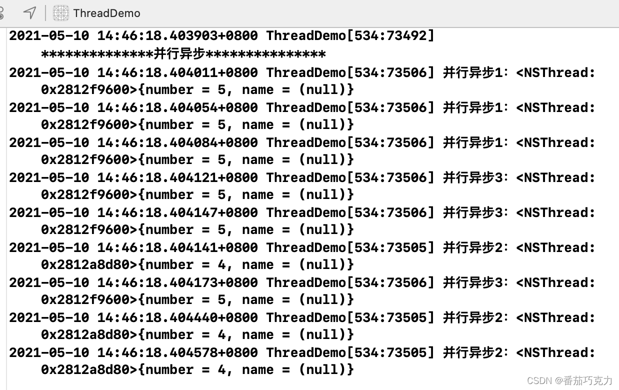 - (void)asyncConcurrent {NSLog(@"**************并行异步***************");dispatch_queue_t queue = dispatch_queue_create("test", DISPATCH_QUEUE_CONCURRENT);dispatch_async(queue, ^{for (int i=0;i<3;i++) {NSLog(@"并行异步1:%@", [NSThread currentThread]);}});dispatch_async(queue, ^{for (int i=0;i<3;i++) {NSLog(@"并行异步2:%@", [NSThread currentThread]);}});dispatch_async(queue, ^{for (int i=0;i<3;i++) {NSLog(@"并行异步3:%@", [NSThread currentThread]);}});}